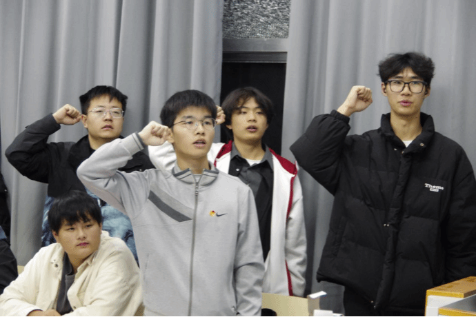 活动尾声,全体团员青年面向团旗,高举右拳,重温入团誓词。铿锵有力的誓言在教室回荡,彰显着团员们不忘初心、牢记使命,为共产主义事业不懈奋斗的坚定决心。